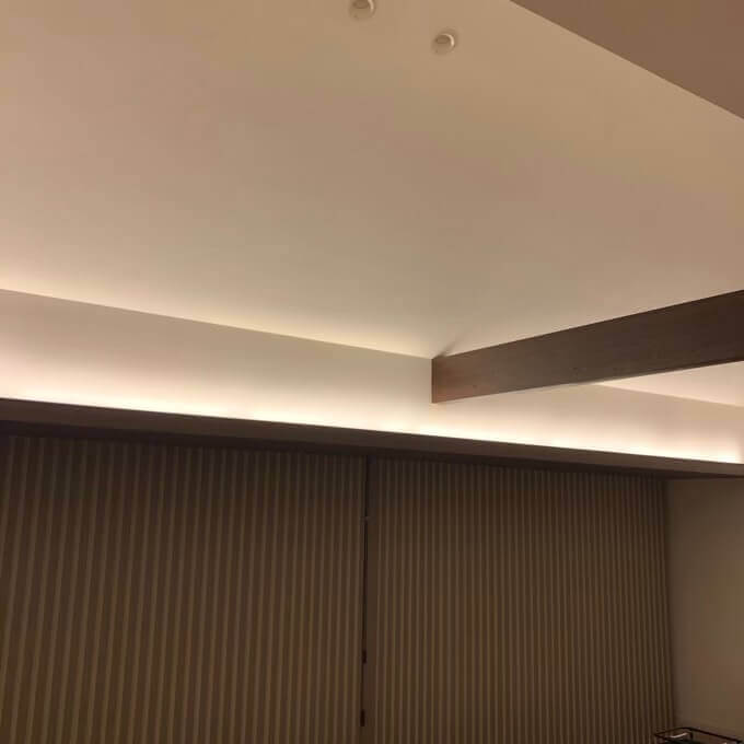 勾配天井の立ち上がり部分は、折り下げ天井にして、間接照明を取り付けています。