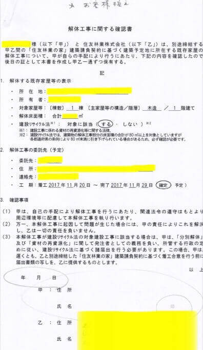 解体業者を他社に依頼する場合、住友林業では確認書のサインを求められました。
