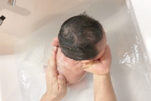 大きな洗面台で沐浴をすることで